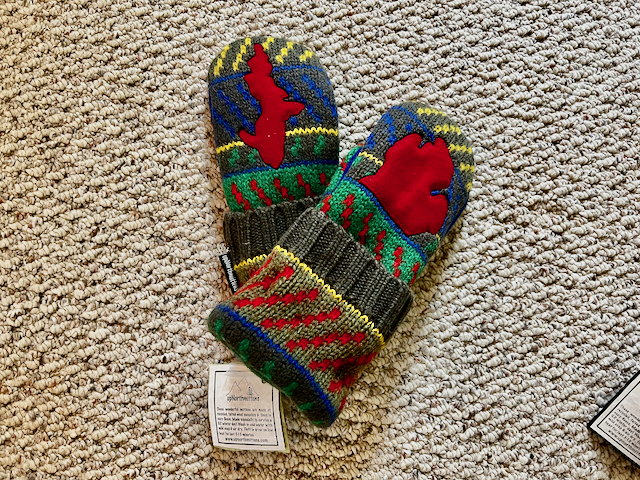What a colorful pair of Michigan mitts! The background is a brownish gray color with bright blue, green, red & yellow accents. The wool Michigan is bright red and the palms are bright blue! We love to hold our hands up in Michigan to show you where we live! There is a tiny diamond and directions how to apply it to your mittens to show your favorite spot in Michigan! These mittens are lined with high quality winter fleece like all of our mittens!