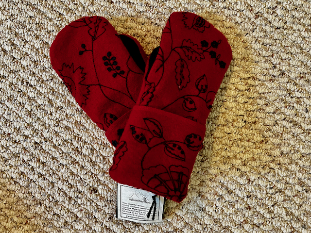 This 100% boiled wool jacket was so beautiful, I almost hated to cut it up! But then I knew what great mittens it would make. There vines, leaves, and berries all over these mittens. The palms are black and they are lined in high quality winter fleece!