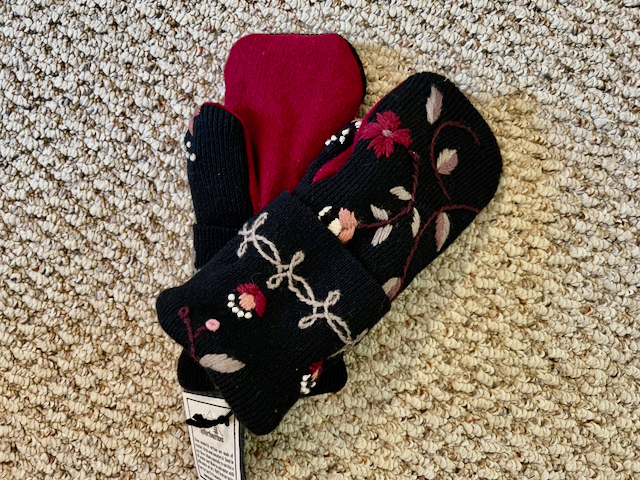 This is such a pretty pair of mittens. The embroidery makes it extra special. The colors remind me of an antique tapestry. The mittens are 100% wool and the palms are a deep burgundy. These mittens are lined with high quality winter fleece like all of our mittens!