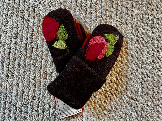 This was a great full length sweater coat and it was so fun with all of these flowers on it! The background is dark, dark brown with flowers in red, pink, and green. One cuff even has a little gold flower on it. They are 100% wool with red palms. All of our mittens have a signature snowflake tag and they are lined with high quality winter fleece.