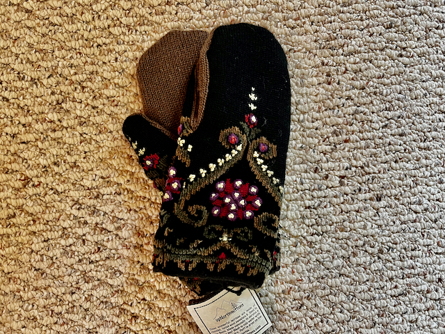 This is a very unique pair of mittens. They are black with a unusual vintage embroidery pattern. The colors are muted and they do not have cuffs. The palms are the same olive green in the embroidery. For that unique individual out there! These mittens are lined with high quality winter fleece like all of our mittens!