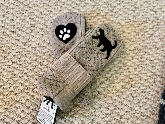 I just love this pair of mittens. There is a very soft black pattern running thru this 100% wool deep tan mitten. Our kitty is just walking thru. He/she has a tiny charm at their neck that says "love (heart) my cat." This pair of mittens is lined with high quality winter fleece and finished off with our signature snowflake charm, like all of our mittens.