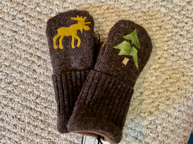 Our favorite Moose is walking thru the woods on this great pair of 100% wool mittens. The palms are made from a pretty brown, tan, and olive green pattern. It matches so well! This pair of mittens is lined with high quality winter fleece and finished off with our signature snowflake charm, like all of our mittens.