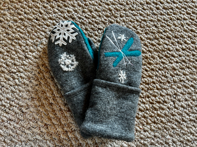 This is great pair of 100% wool mittens! The sweater itself had snowflakes embroidered in and then we added our own. Some of the snowflakes have little beads embroidered in as well. The teal skis match the palms of the mitts and the ski poles are white. How fun for that ski enthusiast. All of our mittens are lined with high quality fleece and feature our signature snowflake charm at the cuff.