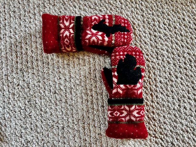 This was the most beautiful sweater, I almost hated to cut it up. But the mittens are just gorgeous. We hold our hands up with pride in Michigan to show you just where we are from. Up North Mittens would be on the left hand on that point sticking out on top. Almost to the end!! The mittens are 100% wool with black palms. They come with a tiny diamond and instructions on how to apply it to your favorite spot in Michigan. All of our mittens are lined with high quality winter fleece and also have our signature snowflake charm at the cuff.