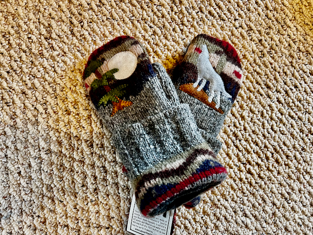 This is one of my favorites! The background behind the applique design looks like a lake with some woods and a pretty sky. These mitts are 100% wool with dark blue palms and a gorgeous patterned cuff. Our wolf, tree and moon are all done in wool and they are lined with high quality winter fleece. You can't go wrong!