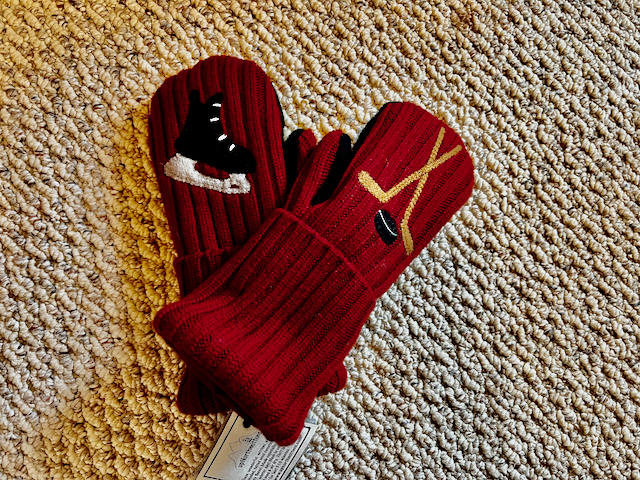 Is there a hockey girl in your life? She will love these 100% wool mittens with a black hockey skate on one hand and sticks/puck on the other! The palms are black and they are lined with high quality winter fleece.