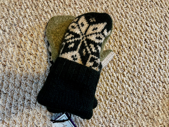 This is a GREAT pair of heavy weight 100% wool mittens for the woman who has cold hands! The beautiful Scandinavian Snowflake Covers the entire mitten. They are a deep forest green with tan accents. The palms are a greenish tan color and they are lined with warm winter fleece. You can't go wrong with these!
