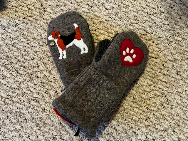 This sweet little beagle is done in 4 different colors of wool to create that one-of-a-kind look. The mittens are 100% done in a brown with a darker brown palm. They are lined with high quality winter fleece and just perfect for the dog lover in your life! Or maybe that's you?!