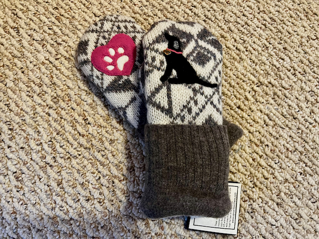 Our sweet black dog is sitting on a beautiful pair of 100% wool mittens in cream and tan. The palms are tan to match the cuff. She has a pink collar with a tiny charm that says "love my dog." What a great gift for the dog lover in your life! They are lined with high quality winter fleece, like all of our mittens.