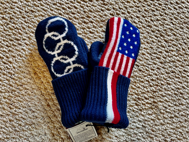 This is the first pair of Olympic Mittens I've made in almost 20 years! This is a VERY HEAVY pair of mittens and it was made from a genuine Olympic Sweater from the 2012 Olympics. I had the tags from the sweater, but somehow they got lost in my sewing room! I was SO mad at myself. Anyway, these mittens are 100% wool with leather strips in the palms for driving or shoveling or whatever! They are lined with high quality winter fleece like all of our mittens. Definitely one-of-a-kind!