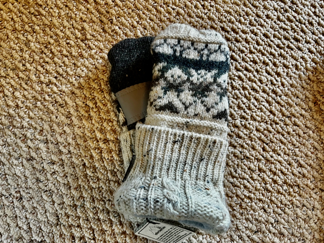 These are luscious 100% heavy weight wool mittens for men. The palms are dark gray with a gray strip of leather sewn into the palm. They are lined with high quality winter fleece and guaranteed to keep your hands toasty warm!