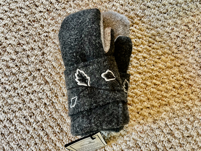 If you have cold hands, then this is the pair of mittens for you! These are heavy weight 100% boiled wool with a nice heavy light gray palm. The leaves going around the cuffs are so pretty! These mittens are lined with high quality winter fleece like all of our mittens! You can't go wrong with this pair!