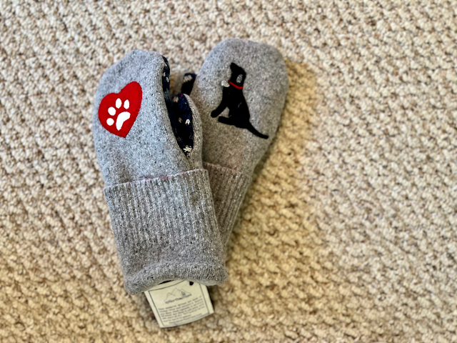 This is a beautiful pair of 100% wool mittens! If you have a black dog, then you just NEED this pair! The palms are a great print with black, teal, blue and cream. The appliques are made of wool and even put on with wool thread! On the dogs collar is a tiny charm that says Love (heart) my dog. These mittens are lined with high quality winter fleece like all of our mittens! What a great gift this would make!