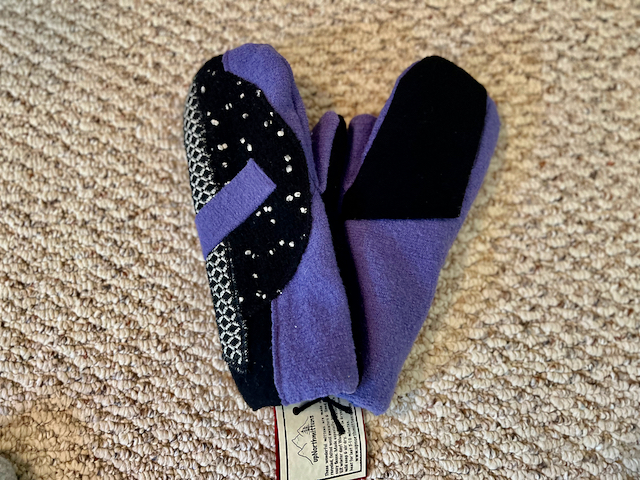 If you want a cute pair of mittens that no one will ever have, here tey are. This was the strangest sweater jacket, so the mittens came out different on each hand! They are 100% wool with purple palms. This pair of mittens is lined with high quality winter fleece and finished off with our signature snowflake charm, like all of our mittens.