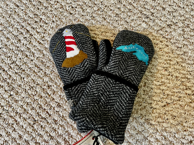 Did you know that Michigan has over 150 lighthouses....more than any other state!! Pretty cool fact! Our lighthouse is on and shining on Lake Superior. Did you know that Lake Superior is the largest of the great lakes? I bet you didn't know you were going to get trivia while shopping for mittens!! The mittens are 100% wool with black palms and Superior printed across the lake. Our mittens are all lined with high quality winter fleece and finished off with our signature snowflake charm!