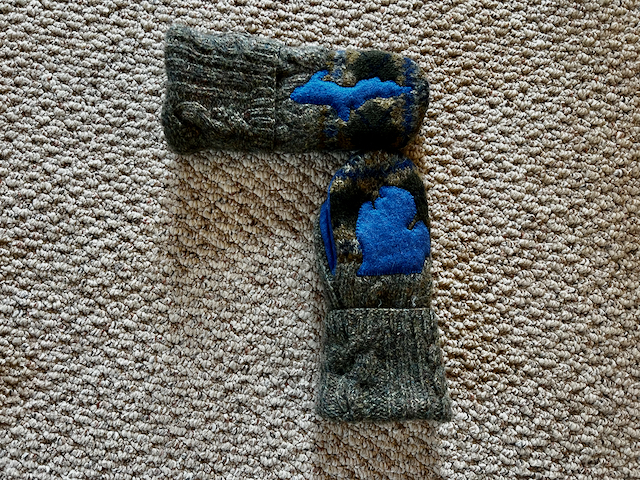 This is such a fun pair of Michigan mitts. The background is a green & blue tweed with a dark green pattern. There is a tiny bit of blue in the pattern as well along with our great state of Michigan. All of the state mittens have a tiny diamond and directions to apply it to your favorite spot in Michigan. The mittens are 100% wool and on the heavy side. All of our mittens are lined with high quality winter fleece and also have our signature snowflake charm at the cuff.