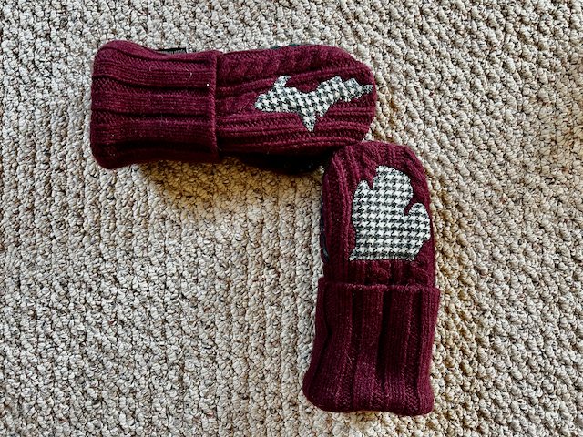 This is definitely a heavy weight mitten! Guaranteed to keep your hands warm in Michigan....or anywhere! They are 100% wool a patterned palm and Michigan Applique also done in wool. Each Michigan mitt comes with a tiny diamond and directions to put it on your favorite spot in Michigan! All of our mittens are lined with high quality winter fleece and also have our signature snowflake charm at the cuff.