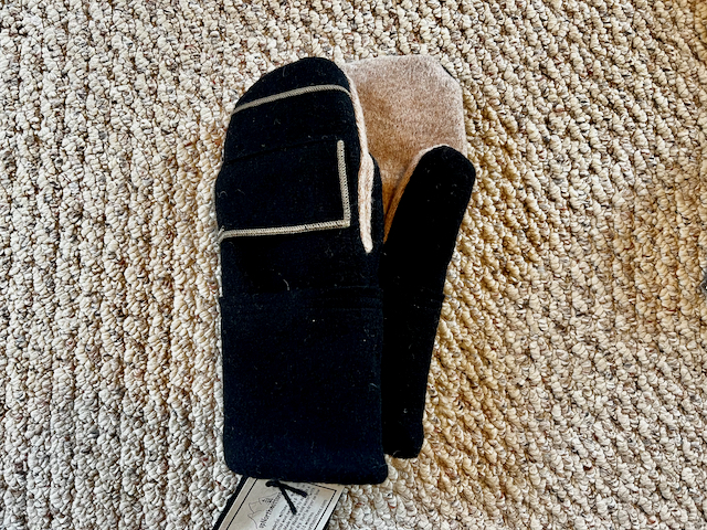 These very sturdy 100% wool mittens came from a sweater by Devernois. Their tiny silver tag is still on the pocket! The palms of these mittens are done in tan wool to match the stitching on the mitten. They are very sleek and stylish.