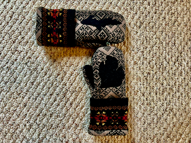 You will absolutely love these Michigan Mitts. The sweater is a beautiful 100% wool with a gorgeous multi-color cuff. The background is a pretty shade of brown with a black pattern. The cuff has a little red, orange, yellow and bright tan. The palms are black and they are lined with high quality winter fleece. You won't be disappointed!