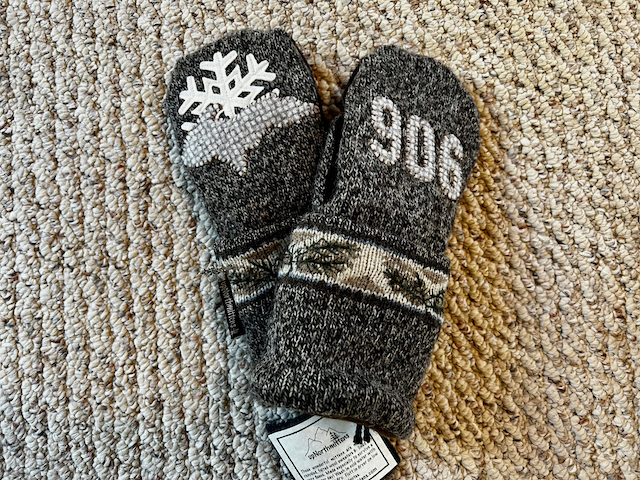 If you live in Upper Michigan you know the entire Upper Peninsula is in the 906 area code. That's God's country! These beautiful mittens are 100% wool with a great pine branch motif cuff. The mitten is a brown tweed with a dark brown palm and warm fleece lining. They are finished off with our tag and a snowflake charm. You won't find these anywhere else but here!